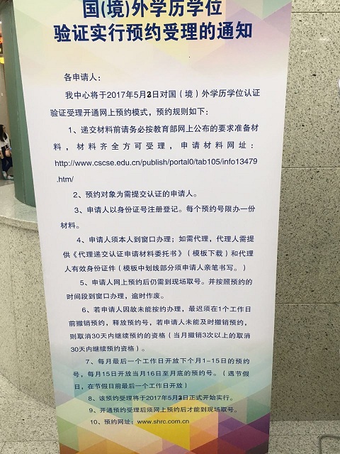 上海學(xué)歷認(rèn)證服務(wù)中心將于2017年5月2日對(duì)國(境)外學(xué)歷學(xué)位認(rèn)證驗(yàn)證受理開通網(wǎng)上預(yù)約模式,預(yù)約規(guī)則如下: